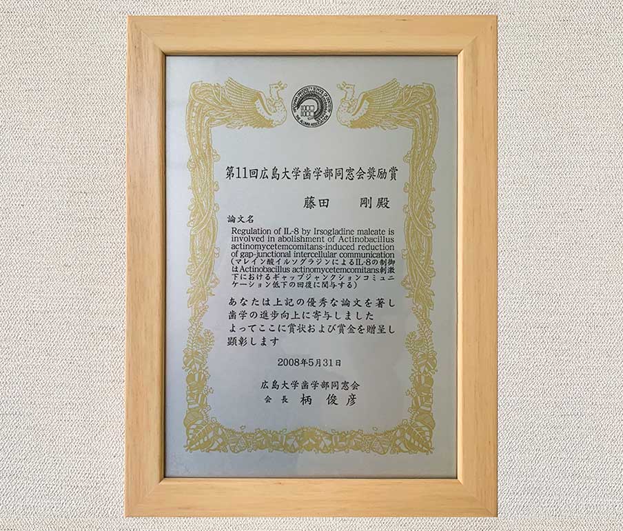 また、愛知学院大学・広島大学にも籍を置かせて頂いていることから、日本歯周病学会を中心とした学術団体と地域医療の核となっている歯科医師会との連携に携わることができれば幸いだと思っています。