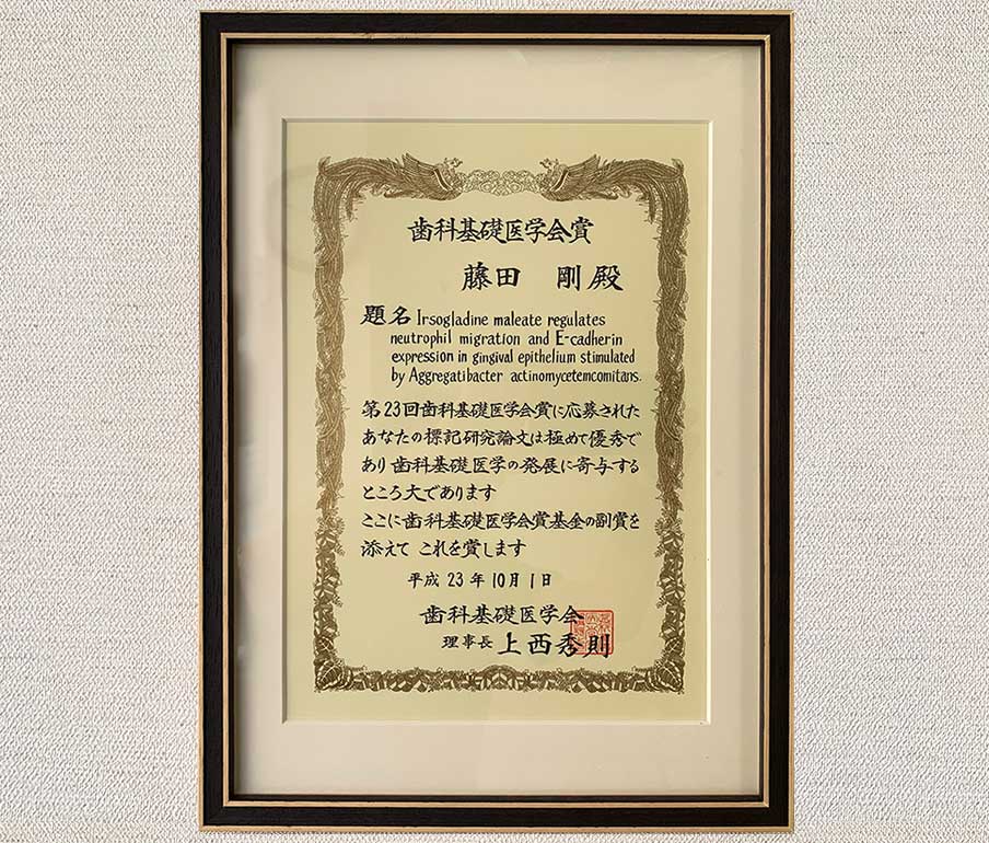 - 第28回歯科医学を中心とした総合的な研究を推進する集い(平成23年度)「歯肉上皮細胞の機能制御に着目した歯周病予防法の開発」(日本歯科医学会)